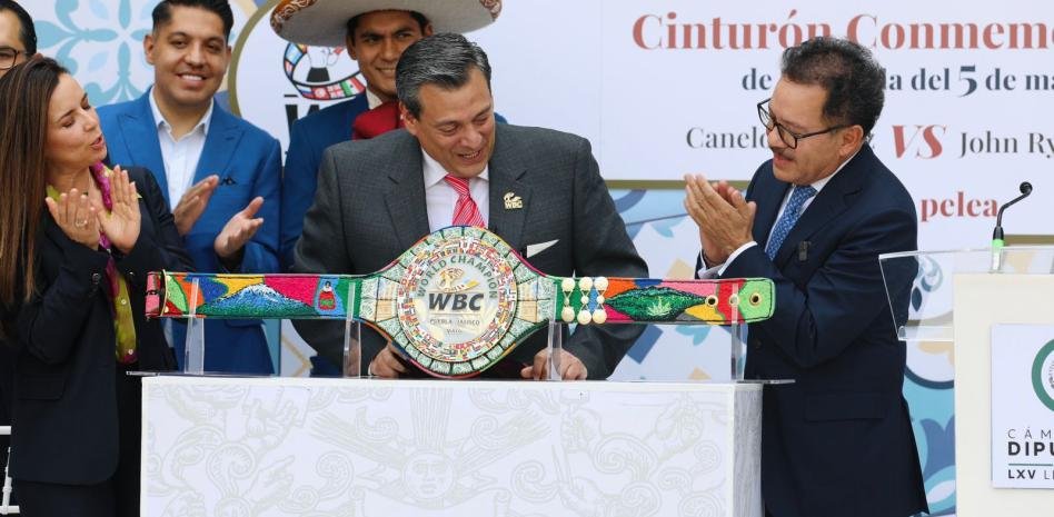 El cinturón que recibirá el vencedor de la pelea de box entre Saúl “El Canelo” Álvarez y John Ryder que se llevará a cabo el próximo sábado 6 de mayo en Guadalajara, Jalisco, fue presentado por Mauricio Sulaimán, presidente del Consejo Mundial de Boxeo, y el coordinador de los diputados de Morena, en el marco de la conmemoración de la Batalla de Puebla.