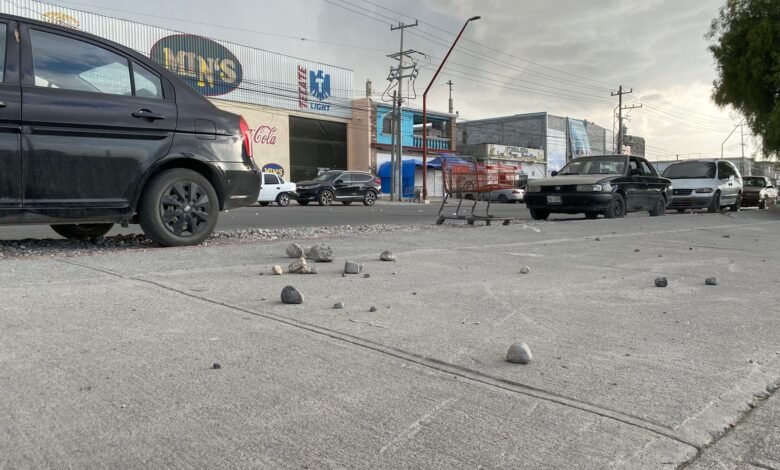 Las piedras están sobre la carpeta asfáltica, en la banqueta, bajo el puente peatonal y hasta deteniendo un carrito del mandado.